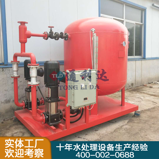(5、结构简单:集闪蒸罐、冷凝水快排装置、压力平衡装置、液位变器、除污器、汽蚀消除器、蓄水箱为一体。一般情况蓄水箱平衡装置压力设备在0.1MPa以下,系统运行是能达到自动启闭、自动报警、自动调压及冷凝水泵自动切换等一系列智能化程序控制。设备整体性好、安装维修方便。