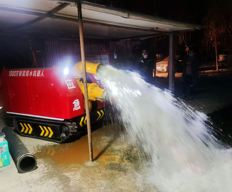 用途及特点:该产品主要作用于城市防汛、应急排水、消防供水、地下停车场等排涝供水功能,重点解决了人员在执行排水任务时,不需随着水位下降而移动吸水泵,极大程度提高了救援工作效率,采用液压平板伸合器以及液压泵连接器,可对潜水泵采用前后倾斜、上下升降机构,适用于多种高低不同水位环境的排水。履带式排水机器人整机的控制方式为便携式遥控器控制,可以控制水泵的每一项动作,并且动作精准可靠。遥控器的有效距离为500米。遥控器采用人工智能学制作,方便操控者节省体力。并且在遥控器上还有急停开关,在关键的时候可以一键急停。